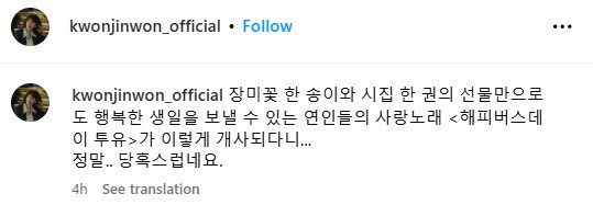 권진원은 오늘(17일) SNS에 "장미꽃 한 송이와 시집 한 권의 선물만으로도 행복한 생일을 보낼 수 있는 연인들의 사랑 노래 '해피버스데이 투 유'가 이렇게 개사되다니"라며 정말 당혹스럽다고 적었습니다.