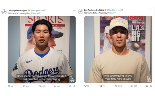 손흥민에게 환영 인사 전하는 김혜성(왼쪽)과 토미 현수 에드먼[로스앤젤레스 다저스 구단 소셜 미디어 캡처. 재배포 및 DB 금지][로스앤젤레스 다저스 구단 소셜 미디어 캡처. 재배포 및 DB 금지]미국 메이저리그 LA 다저스에서 뛰는 김혜성이 같은 로스앤젤레스를 연고로 하는 축구팀, LA FC에 입성한 손흥민에게 직접 환영인사를 전했습니다.