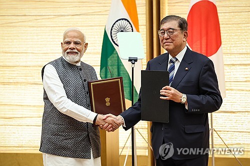 악수하는 일본·인도 정상[도쿄 EPA=연합뉴스 자료사진 제공][도쿄 EPA=연합뉴스 자료사진 제공]이시바 시게루 일본 총리와 나렌드라 모디 인도 총리가 29일 도쿄 총리 관저에서 회담을 열어 안보·경제 협력을 강화하고 인적 교류를 확대하기로 했습니다.
