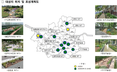 서울시는 또 올해 11월 말까지 ▲ 서초구 올림픽대로변 녹지(4천500㎡) 및 경부고속도로변 부체도로 녹지(1만6천㎡) ▲ 강서구 서남물재생센터 녹지(1천500㎡) ▲ 강남구 수서오솔길(1만2천㎡) 등 10곳에 대규모 녹지를 확충할 예정입니다.