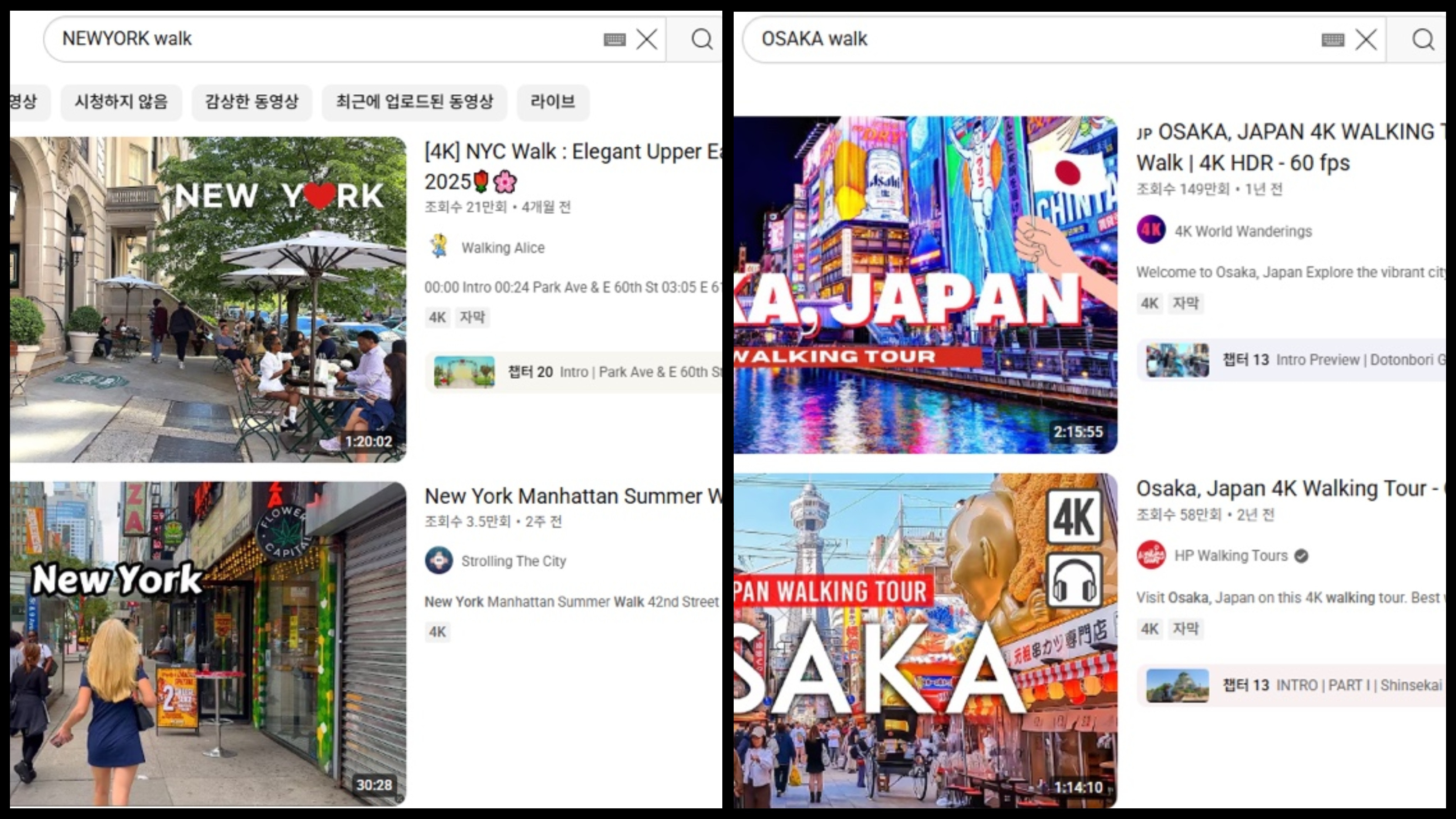 뉴욕과 오사카의 '도시 걷기' 영상[유튜브 캡처][유튜브 캡처]그러나 여러 사람이 자유롭게 오가는 장소에서 촬영된 영상을 대상으로는 법적 제재가 쉽지 않은 실정입니다.