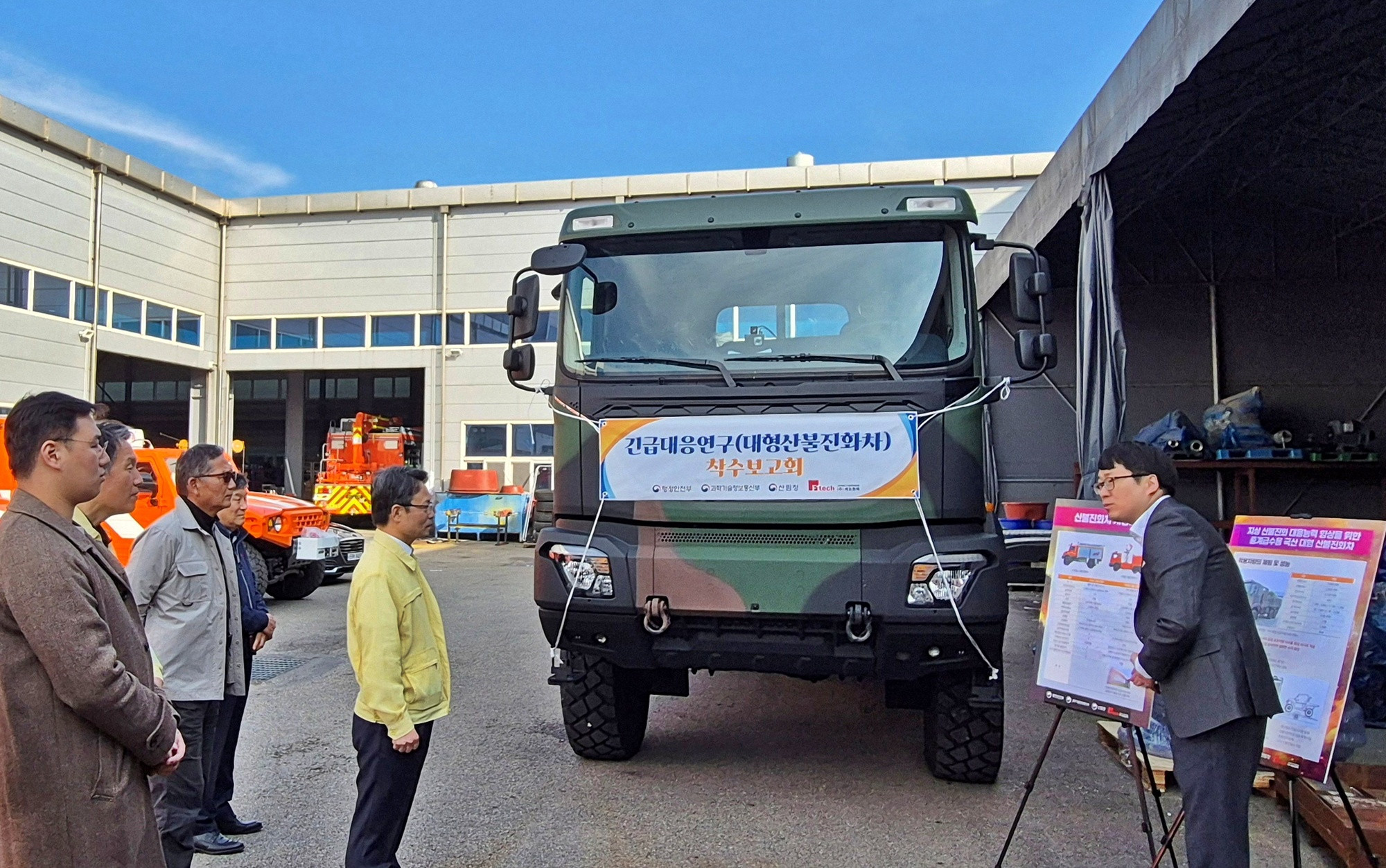 과학기술정보통신부와 행정안전부, 산림청은 오늘(5일) 경기도 화성시 바이오밸리 소재 연구기관에서 대형헬기 물탱크의 2배에 달하는 물탱크를 탑재하면서도 차체와 특장을 모두 국산화한 '대형산불 진화차량의 긴급 대응연구 현장 착수보고회'를 개최했습니다.