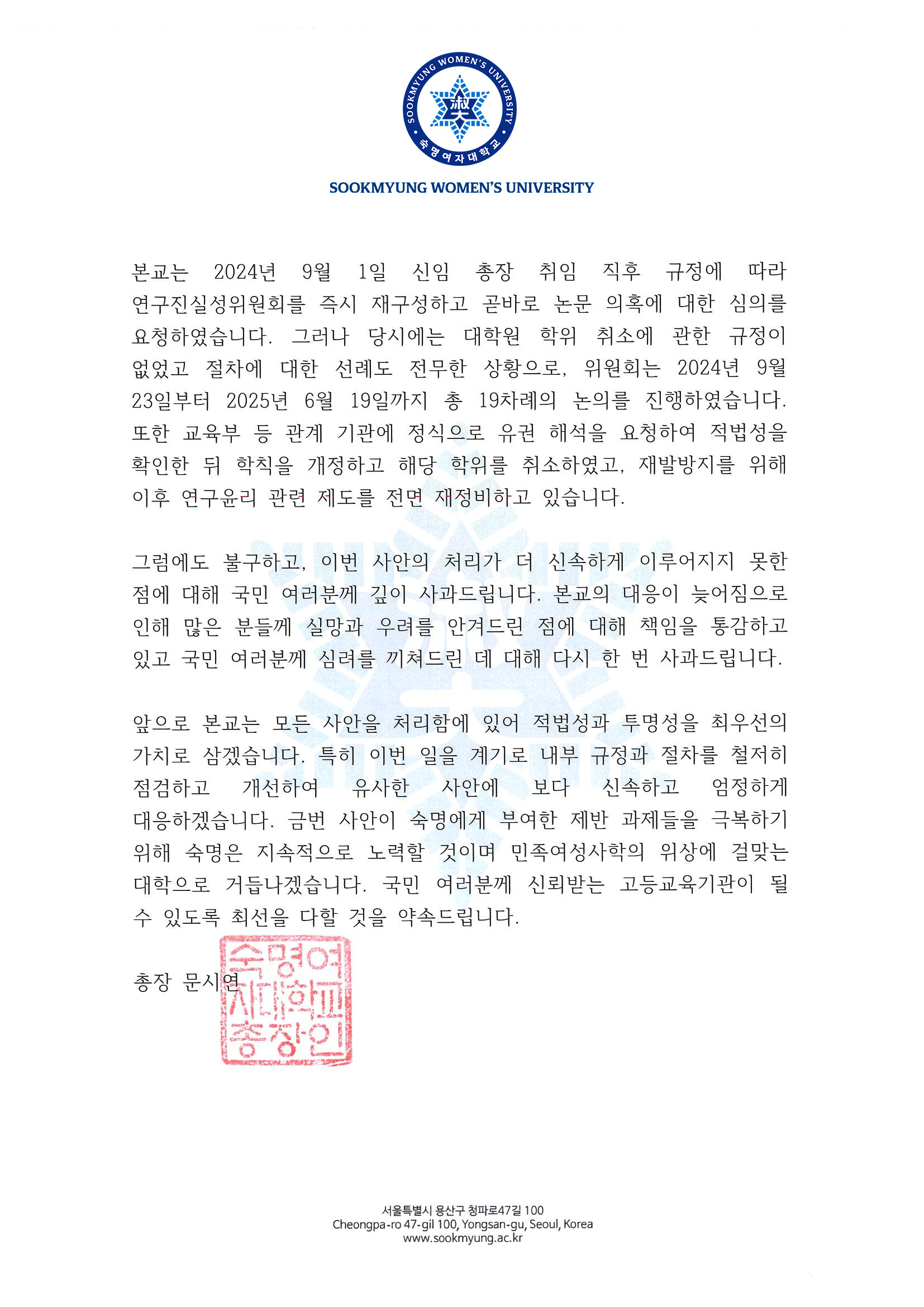 문 총장은 오늘(3일) 학교 홈페이지에 입장문을 내고 "이번 사안의 처리가 더 신속하게 이뤄지지 못한 점에 대해 국민 여러분께 깊이 사과한다"며 "본교 대응이 늦어져 많은 분들께 실망과 우려를 안긴 점에 대해 책임을 통감하고 있다"는 입장을 밝혔습니다.