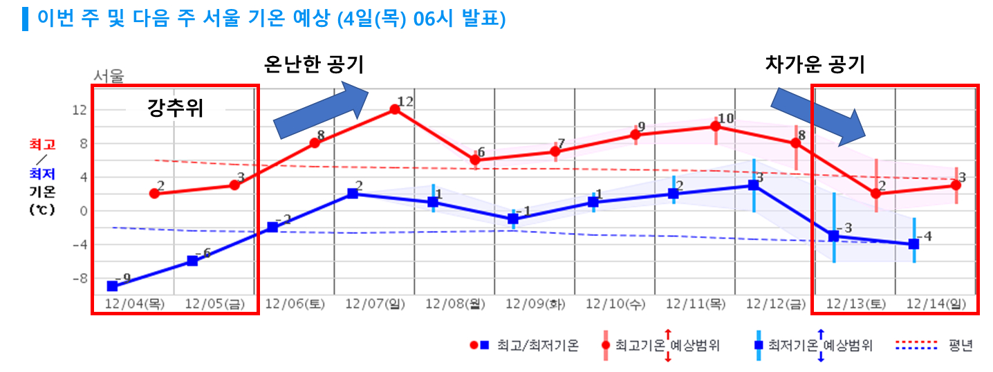 서울 기온 전망 [기상청 제공]강추위는 금요일(5일)까지 이어질 전망입니다.