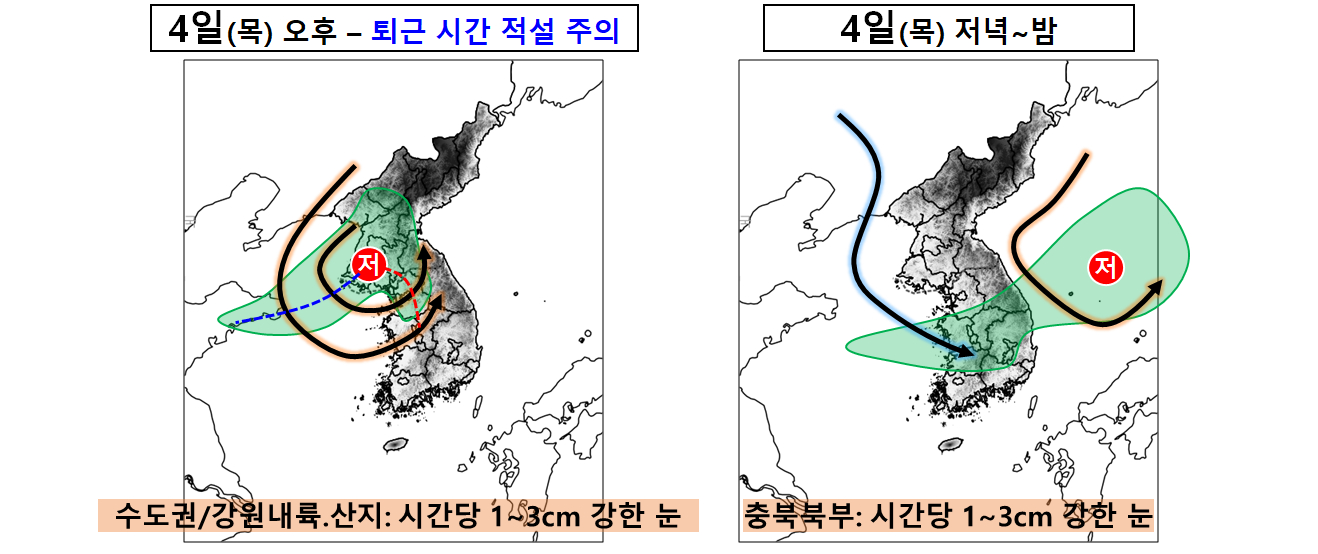 발해만 부근에서 발달한 저기압이 중부 지방을 통과하면서, 오늘(4일) 늦은 오후부터 곳곳에 눈이 오기 시작하겠습니다.