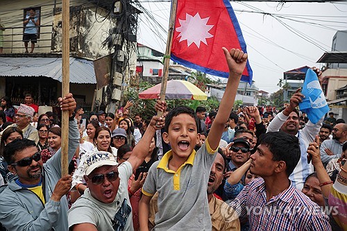 네팔 총선 중도 신생정당 압승7일(현지시간) 네팔 동부 자파 지역에서 중도 국민독립당(RSP) 지지자들이 총선 승리에 환호하고 있다.[로이터=연합뉴스]7일(현지시간) 네팔 동부 자파 지역에서 중도 국민독립당(RSP) 지지자들이 총선 승리에 환호하고 있다.