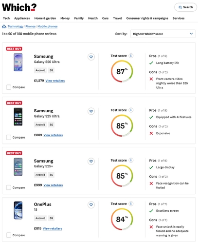 '위치'는 총점 87점으로 갤럭시 S26 울트라를 스마트폰 랭킹 1위에 선정하며 전반적인 성능과 프라이버시 디스플레이를 높게 평가했습니다.