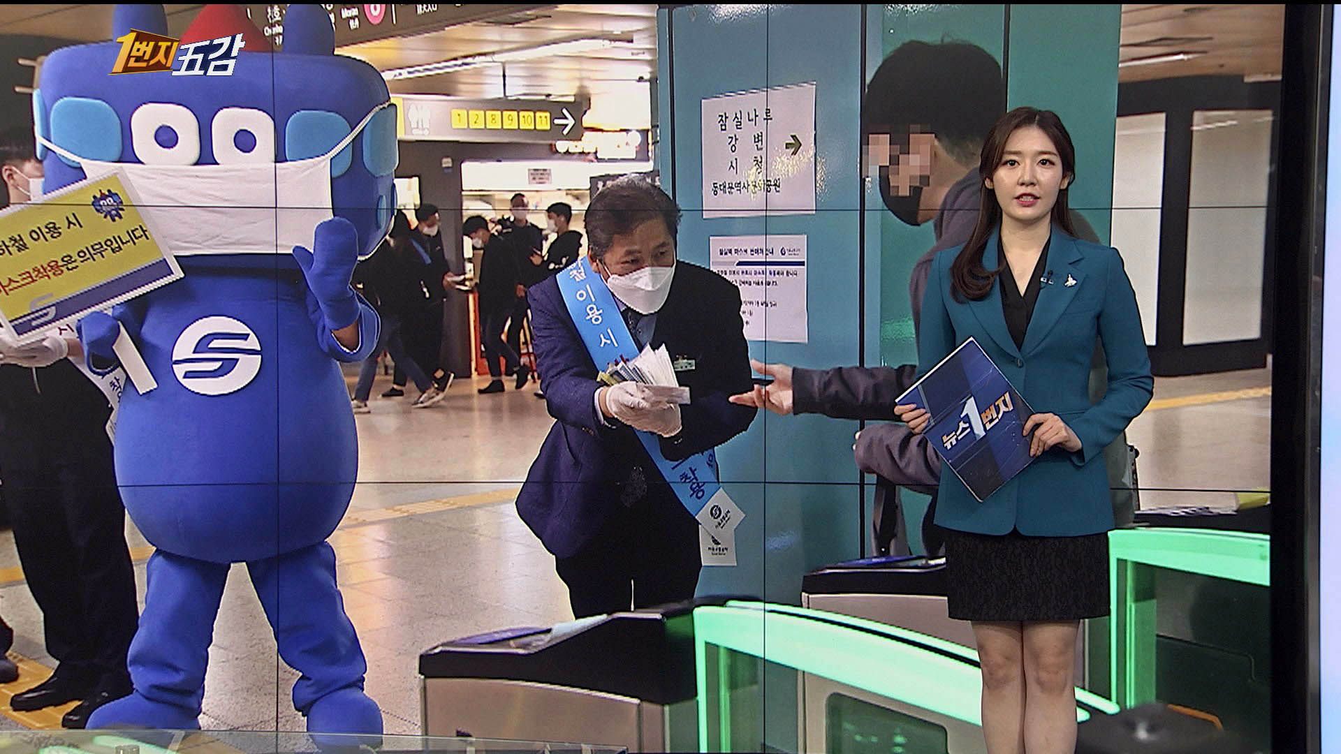 지하철역에서 관계자들이 시민에게 마스크를 나눠주고 있습니다.