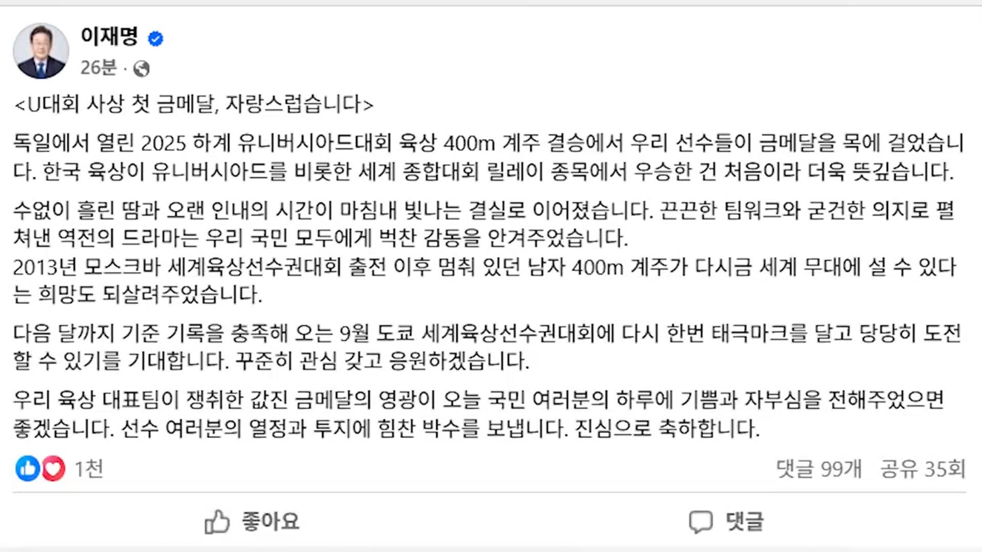 이재명 대통령은 우리나라 육상 남자 계주 400m 대표팀의 하계 유니버시아드 대회에서 금메달을 딴 것을 크게 축하했습니다.