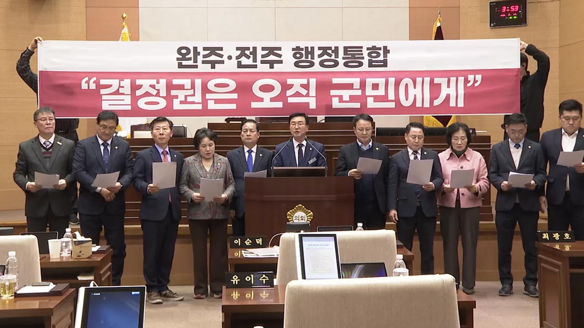완주군의회 의원 전원 "행정통합 결사 반대"